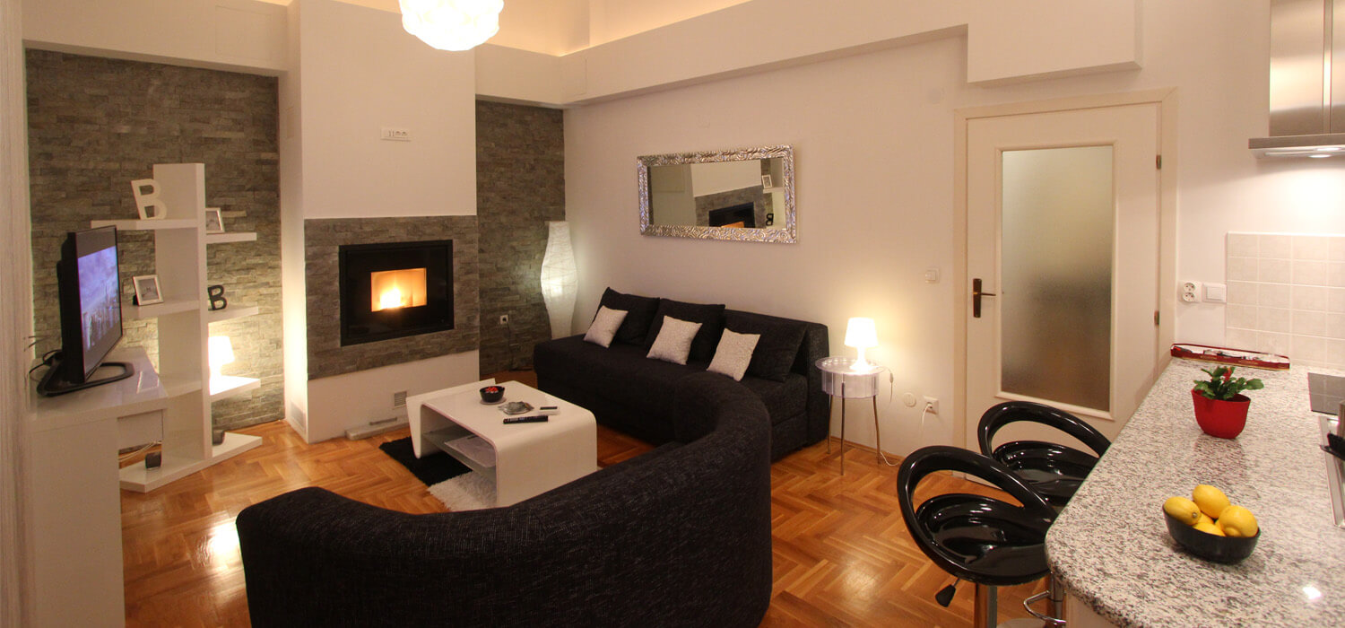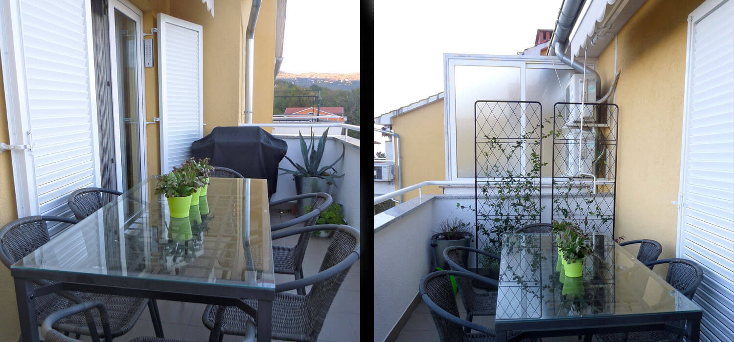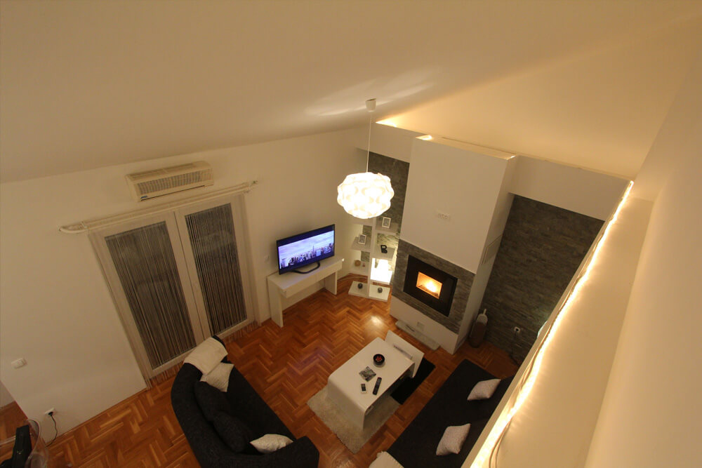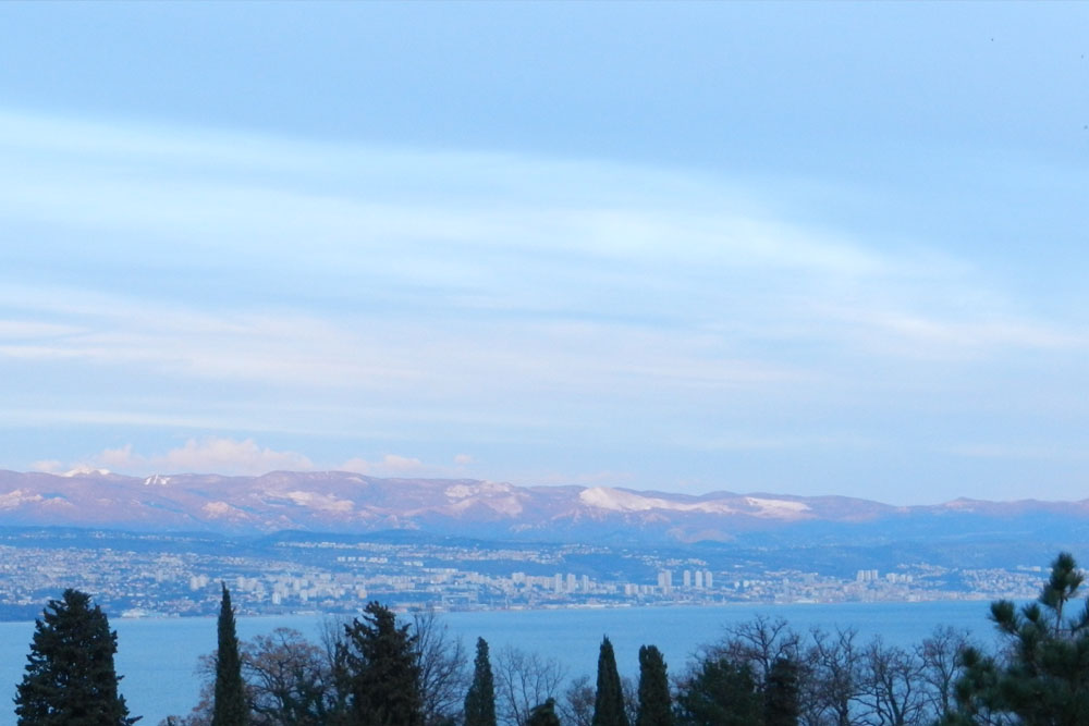Im Wohnraum dominiert der Kamin, TV WLAN, Bibliothek, Sitzgarnituren mit Tischchen und ein besonders attraktiver Blick auf die Kvarner Bucht reflektiert sich auch im Spiegel des Wohnraums. Eine Glaswand verbindet den Wohnraum und den geräumigen Balkon, und fügt sich mit der natürlichen Umgebung in ein einzigartiges Ganzes der Kvarner Bucht und Natupark Učka ein. Für diejenigen die im Freien essen möchten in einem gemütlichen Schatten unter einer Markise oder abends bei einer intimen Beleuchtung mit wunderschönen Meerblick befindet sich der Grill und Tisch zum Essen für sechs Personen. Der Balkon wurde mit mediterranen Pflanzen bepflanzt die mit deren Duft die mediterrane Atmosphäre verschaffen. Es gibt Platz für den Aufenthalt von 4 bis 6 Personen, und Parkplatz ist gesichert.